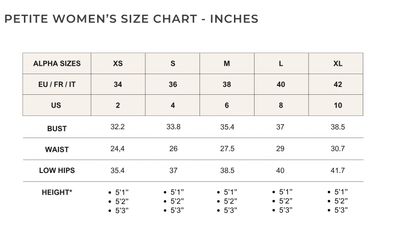 To provide the most accurate fit for petite women, each size (XS–XL) will be offered in three height options: